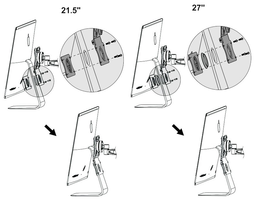 Fixní VESA adaptér pro plochou obrazovku Apple iMac s úhlopříčkou od 21,5" do 27" a nosností až 15 kg. Adaptér disponuje otvory VESA 75 × 75 a 100 × 100 mm pro montáž stůl nebo na stěnu.
