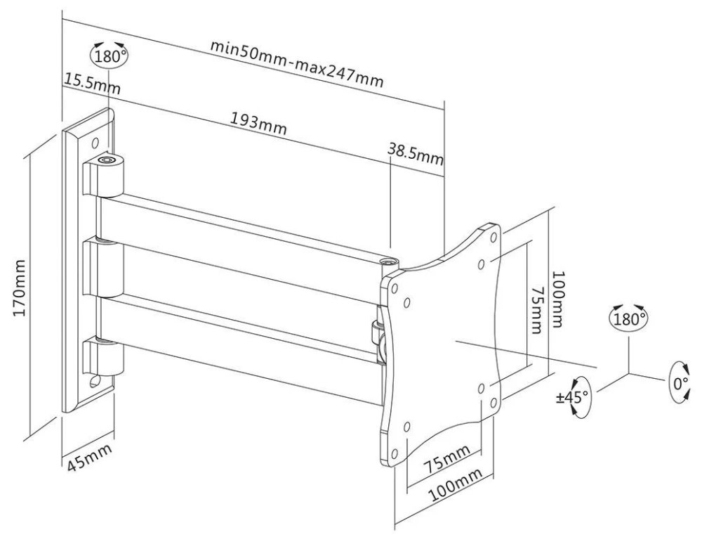 Sklopný a otočný nástěnný držák pro ploché obrazovky s úhlopříčkou od 10" do 27" a hmotností až 15 kg umožňuje snadné nastavení náklonu i horizontálního otočení monitoru. Hloubka držáku je nastavitelná od 5 do 25 cm. Možnost náklonu -45° až +45° a otáčení -90° až +90° umožňuje nastavit ten nejlepší úhel pohledu pro maximální flexibilitu při sledování obrazovky. Držák je kompatibilní se standardy VESA 75 × 75 až 100 × 100 mm.