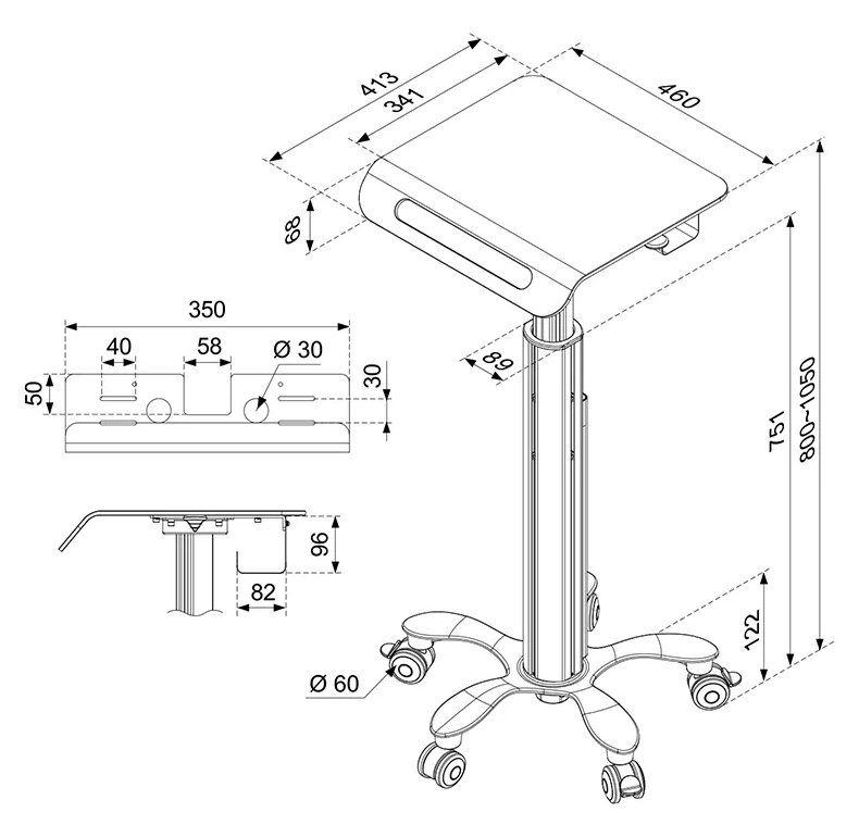 Pojízdný stojan pro notebook s úhlopříčkou od 10" do 18" a maximální hmotností 8 kg. Umožňuje snadné nastavení výšky v rozsahu 80 až 105 cm. Veškerý instalační materiál je součástí výrobku.