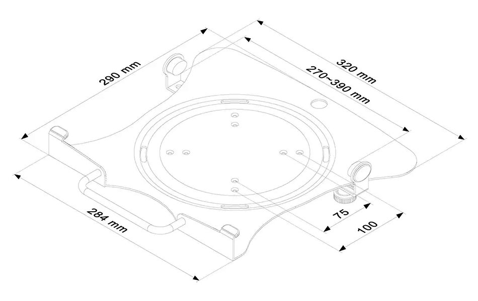 Univerzální držák notebooku nabízející maximální funkčnost. Instaluje se na jakýkoli držák pomocí vzoru otvorů VESA 75 × 75 nebo 100 × 100. Veškerý instalační materiál je součástí výrobku.