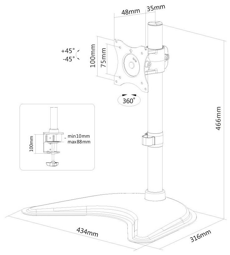 Flexibilní VESA stojan pro plochý LCD monitor o velikosti 10" až 30" a nosnosti do 10 kg. Stojan je možné manuálně zvýšit až do 46 cm a je vhodný pro obrazovku, která splňuje vzor otvorů VESA 75 × 75 nebo 100 × 100 mm. Různé vzory otvorů lze pokrýt pomocí VESA adaptérů. Veškerý instalační materiál je součástí výrobku.