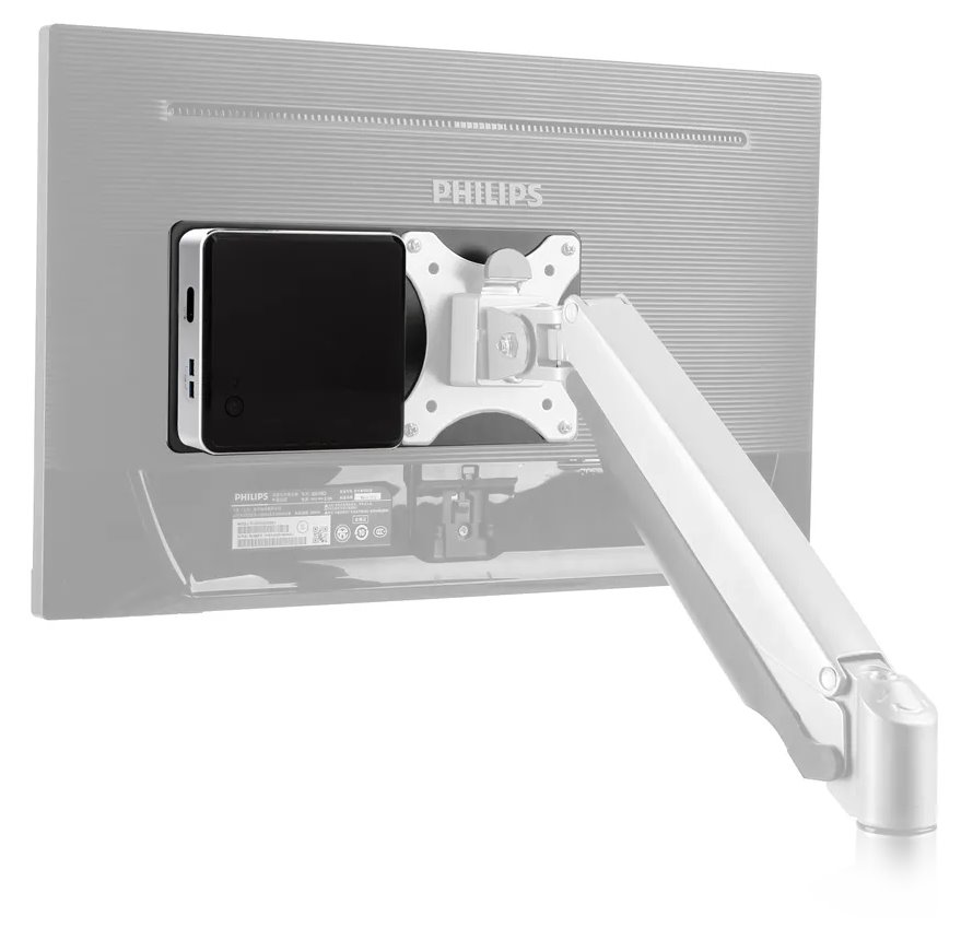 Držák umožňuje připevnit tenký klientský počítač (Nuc/Thin) k držáku monitoru/televizoru s otvory VESA 75/100. Veškerý instalační materiál je součástí výrobku.