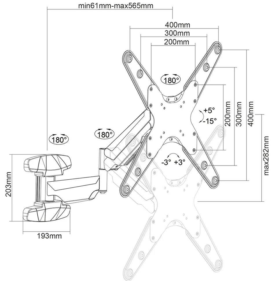 Otočný a sklopný nástěnný držák pro ploché obrazovky s úhlopříčkou od 32" do 55" a nosností až 30 kg umožňuje díky technologii náklonu -15° až +5°, úhlu otáčení -90° až +90° a rotaci -3° až +3° nastavit jakýkoliv úhel pohledu pro maximální flexibilitu při sledování obrazovky. Intuitivní systém správy kabeláže minimalizuje nepořádek. Hloubka držáku je snadno nastavitelná od 6,1 do 56,5 cm a je zde i možnost výškového nastavení pomocí plynové pružiny. Držák je kompatibilní se standardy VESA 75 × 75 až 400 × 400 mm.