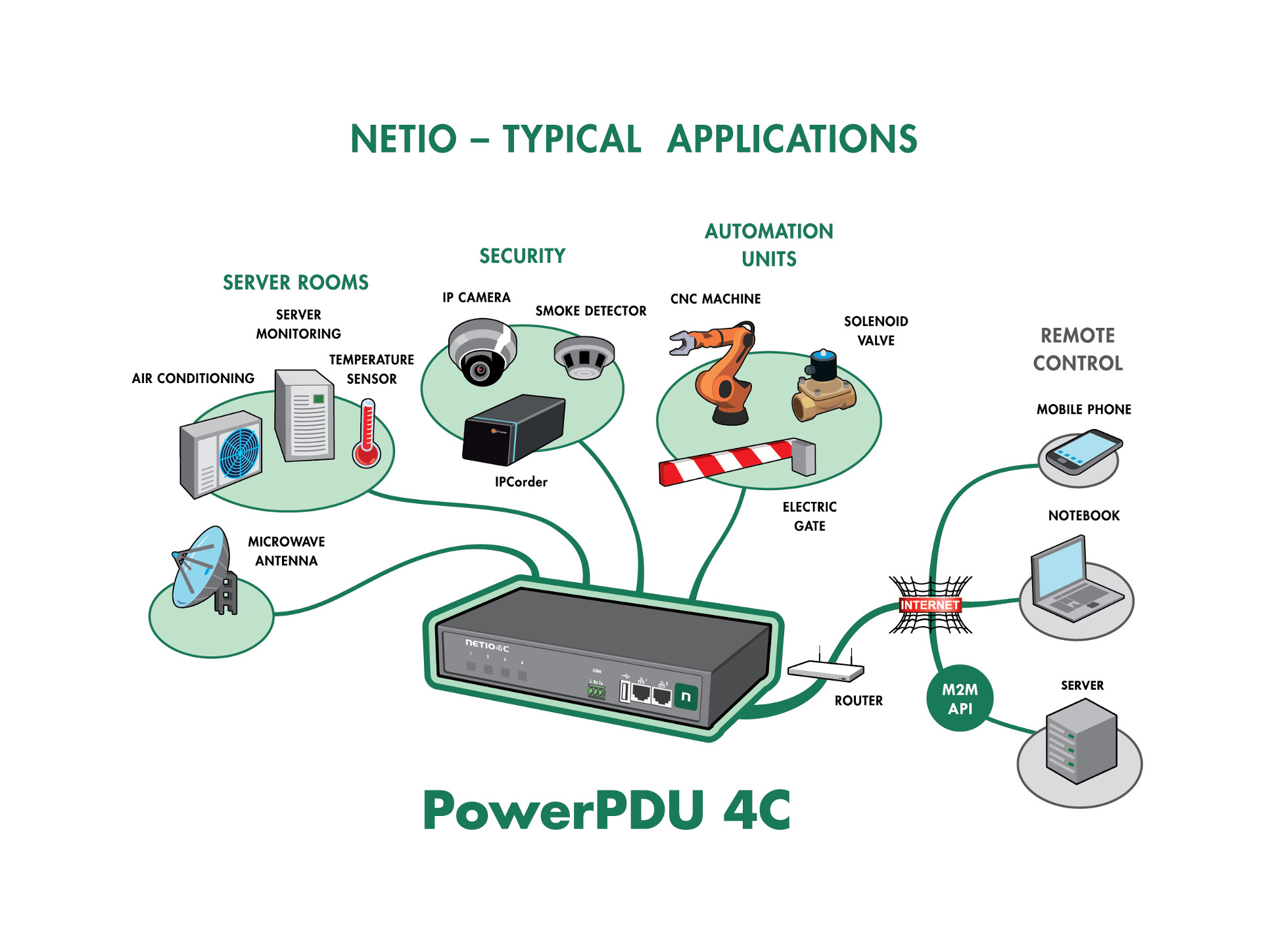 Pomocí služby NETIO Cloud, lze jednotku a její jednotlivé výstupy ovládat na dálku odkudkoliv. (NETIO Cloud je placená služba, používá TLS zabezpečení a servery v Evropě.)