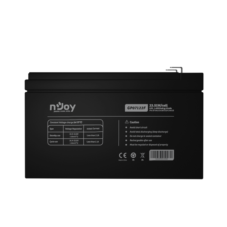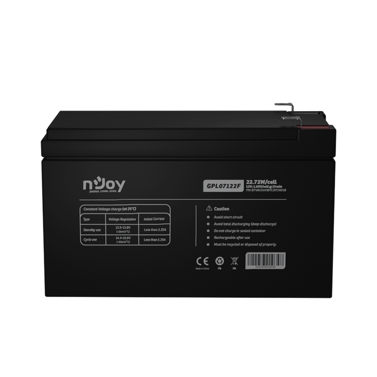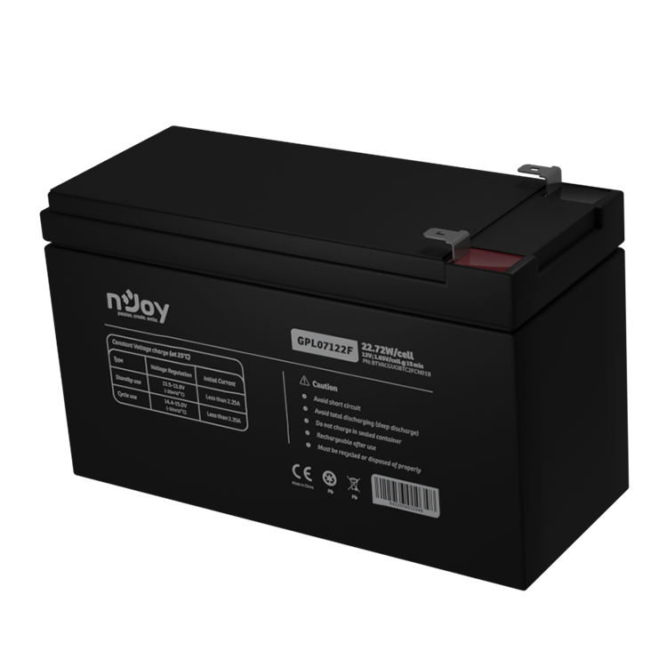 Baterie GP09122F je 12V 9Ah dobíjecí baterie značky nJoy. Výhodou baterie je její nízká údržnost a nízké samovybíjení. Pokles baterie činí jen 3% měsíčně. Rozměry: 151x65x95 mm; Baterie je vhodná pro využití v zabezpečovacích systémech, UPS, zdravotnic...