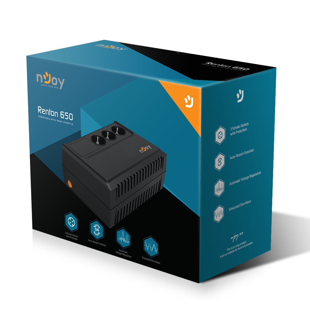 nJoy Renton 650 je UPS vhodná pro každodenní zabezpečení a zálohu většiny vašich elektronických zařízení. Renton 650 je vybaven 3 zásuvkami Schuko připojenými do interní baterie, samorestartovací funkcí, AVR pro konstantní úroveň napětí a simulovanou sinusovou vlnu. Integrované LED indikátory vás informují o veškerých změnách stavu UPS. Renton 650 je vysoce spolehlivým a perfektním zařízením, které zabezpečí veškeré připojené spotřebiče proti výpadku proudu nebo nenadálým událostem, jako je například přepětí či bouřka.