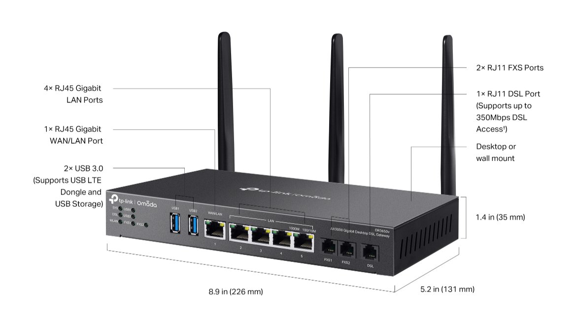 Router je vybaven 3 porty RJ11 (2x FXS a 1x DSL) a 5 gigabitovými RJ45 porty (1x WAN/LAN port a 4x LAN port), které splňují různé požadavky na připojení k internetu. Funkce Load Balance vyvažuje zátěž mezi DSL a Ethernet WAN připojením. Dva USB 3.0 porty poskytují vyšší přenosovou rychlost pro mobilní připojení.