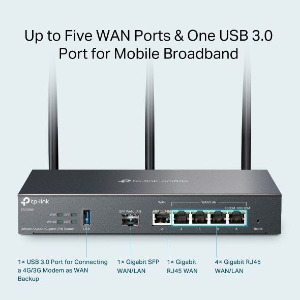 Router je vybaven 1 gigabitovým SFP a 5 gigabitovými RJ45 porty, které splňují různé požadavky na připojení k internetu. Funkce Multi-WAN Load Balancing rozdělí datové toky podle podílu šířky pásma každého portu WAN, aby se zvýšila míra využití širokopásmového připojení. Port USB 3.0 poskytuje vyšší přenosovou rychlost pro mobilní připojení.