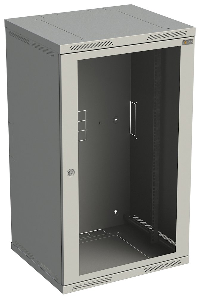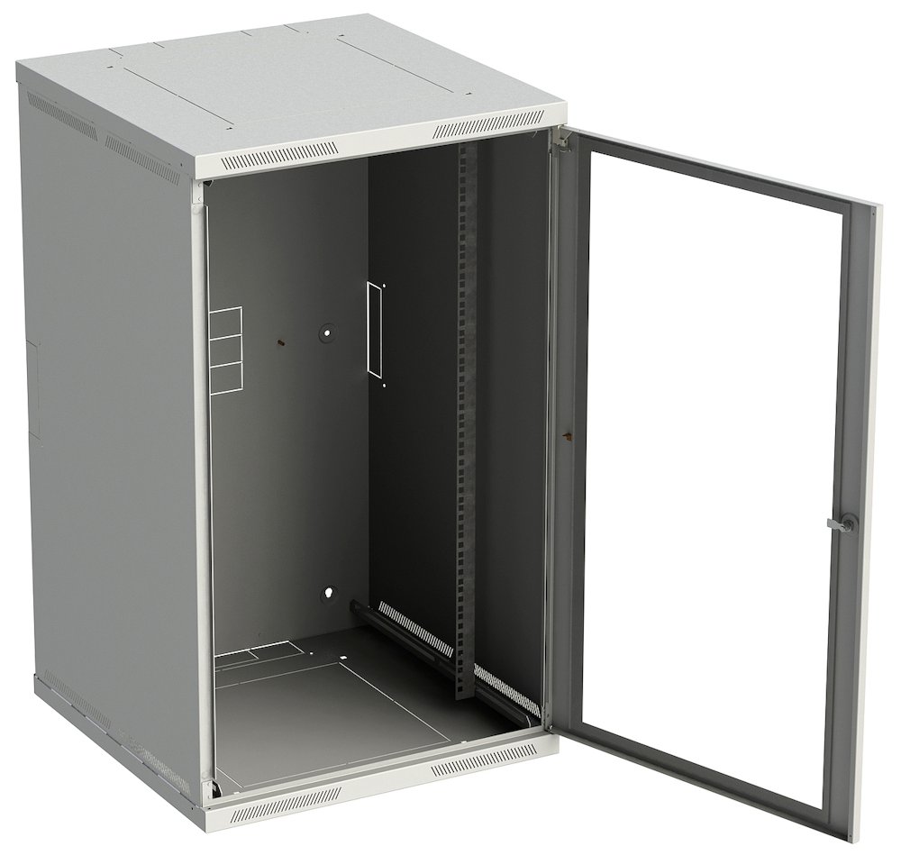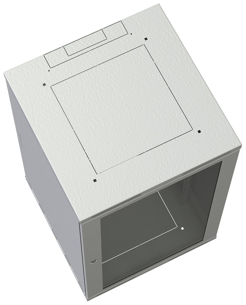 Nástenný 19" datový rozvadec SENSA s nýtovanou konstrukcí, výška 21U, rozmery 600 × 600 mm, bezpecnostní sklenené dvere, perforace pro vetrání, stupen krytí IP 20, nosnost 45 kg, barva RAL 7035.Více info