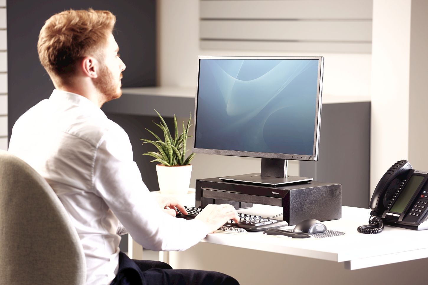 Používáním stojanu pod monitor Fellowes Designer Suites předcházíte bolesti šíje a krční páteře. Umožňuje nastavení monitoru na úroveň očí, čím zmírňuje svalové napětí ramen a krku. Vhodné do kanceláře i domácnosti. Určen pro všechny typy monitorů či LCD / TFT monitorů do hmotnosti do 18 kg. • moderní design • usnadňuje organizaci pracovního prostoru • určen pro LCD a TFT monitory do maximální hmotnosti 18 kg • možnost regulace výšky - 3 pozice: 110, 130, 150 mm • integrovaná zásuvka na drobné kancelářské příslušenství • protiskluzové gumové nožičky • snadná instalace bez nutnosti použití nástrojů • materiál : plast • barva : černá • rozměry : 111×406×238 mm Doporučen Mezinárodní akademií pro ergonomické produkty FIRA™