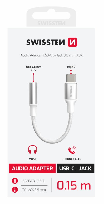 (Registrace)SWISSTEN AUDIO ADAPTÉR TEXTILE USB-C (samec) / 3,5mm AUX 0,15 M BÍLÝ (nahrazuje 73501302)