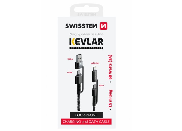 SWISSTEN DATOVÝ KABEL KEVLAR 4in1 3A 1,5 M ANTRACIT Spousta kombinací Součástí kabelu jsou nástavce, díky nímž získáte více možností kombinací dobíjecích konektorů. - USB-A / USB-C - USB-A / lightning - USB-C / USB-C - USB-C / lightning Výkon ...Více info