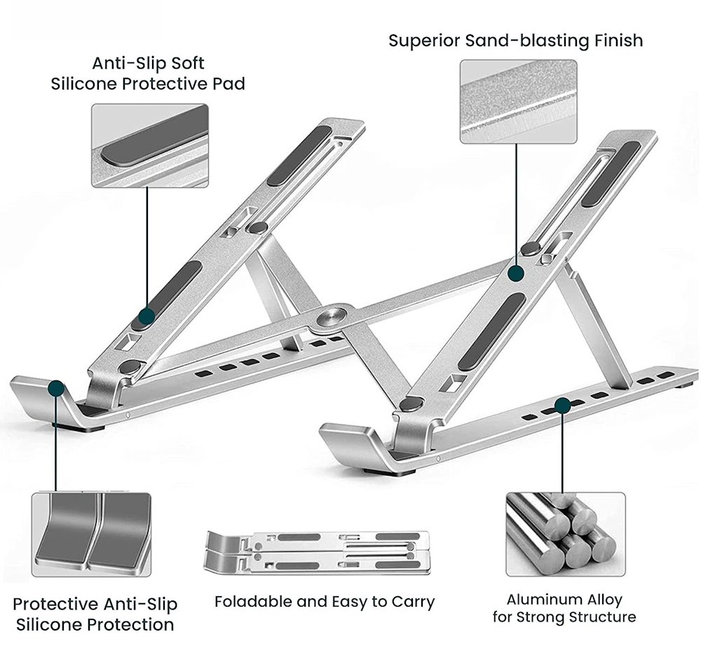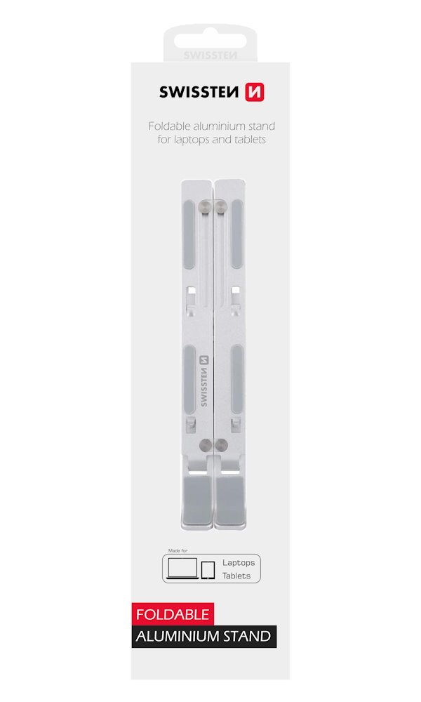 Stojánek na notebook SWISSTEN, který je zhotoven z broušeného hliníku a je vhodný jak na pracovní stůl v kanceláři, tak domácnosti. Úchytný systém disponuje silikonovými protiskluzovými podložkami, díky čemuž notebook pevně a bezpečně drží na svém místě. Konstrukce umožňuje také snadné složení a přenášení.