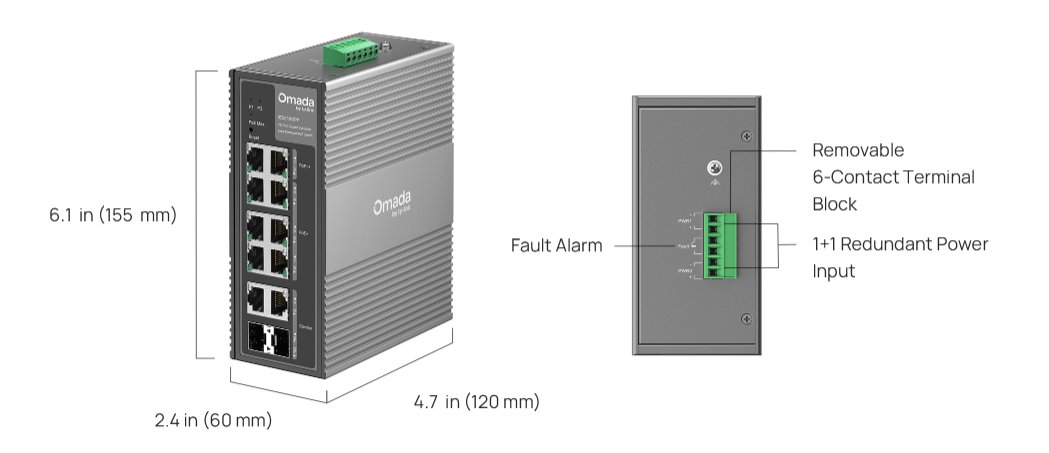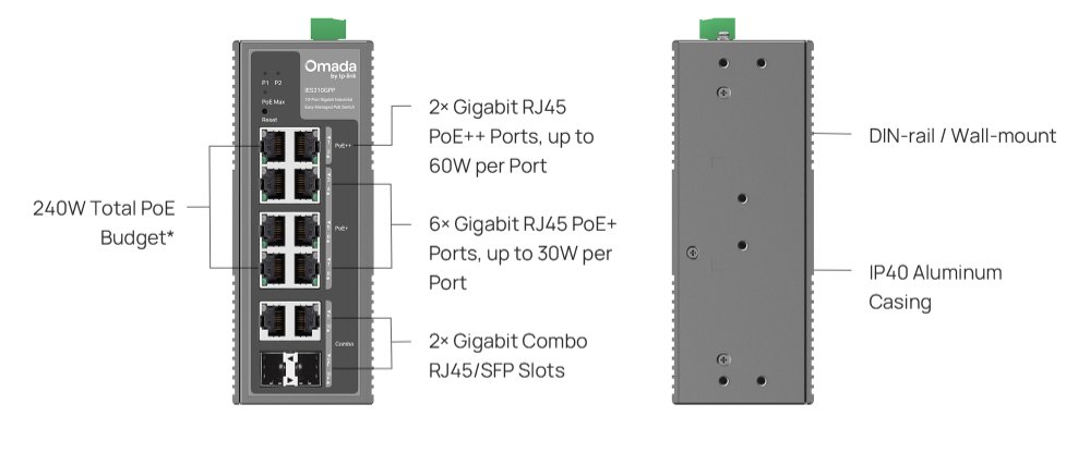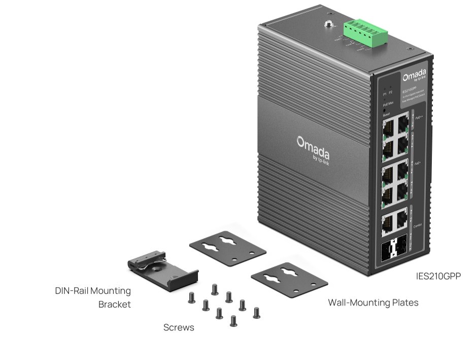 Průmyslový switch TP-Link IES210GPP je vybavený dvěma kombinovanými gigabitovými R45/SFP sloty a osmi gigabitovými RJ45 porty, z nichž 2 podporují PoE++ a 6 portů podporuje napájení PoE+. K dispozici máte celkový rozpočet napájení 240 W (až 60 W na každý port PoE++). Odolné hliníkové pouzdro s krytím IP40 zajišťuje odolnost vůči nepříznivému počasí a teplotám od -40 do +75 °C. Samozřejmostí je navíc ochrana proti blesku 6 kV. Switch nainstalujete buď na DIN lištu, nebo na stěnu.