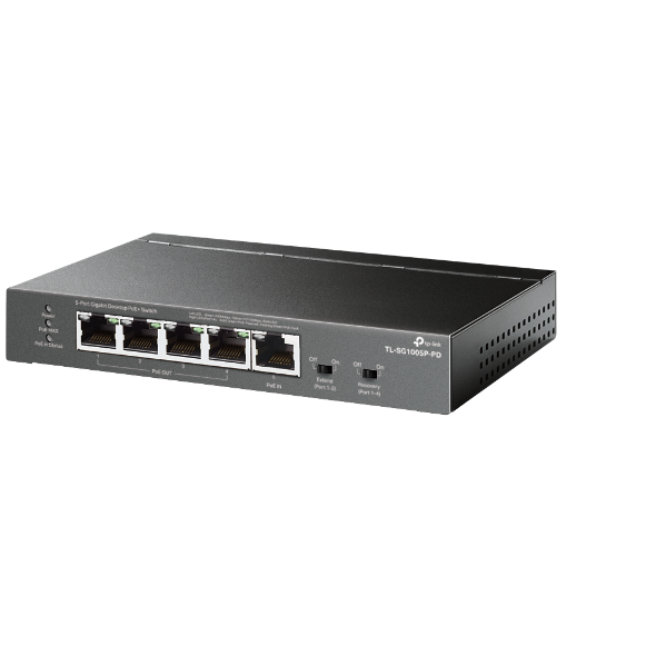 Switch TP-Link TL-SG1005P-PD je vybavený celkem pěti 10Mbps/100Mbps/1Gbps RJ45 porty. Z toho má 1 Gigabit PoE++ vstup a 4 PoE+ výstupy. Switch spolupracuje se standardy 802.3bt typ 4, 802.3bt typ 3, 802.3at a 802.3af PoE. Pomocí kabelu současně přenášíte data a napájíte zařízení s výkonem až 66 W.