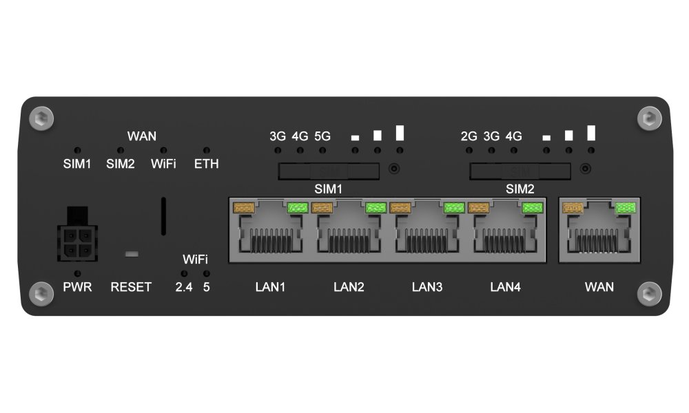 Porty: 5× RJ-45 (1× WAN, 4× LAN), 2× SIM slot (mini SIM, formát 2FF), 1× digitální vstup (DI), 1× digitální výstup (DO)