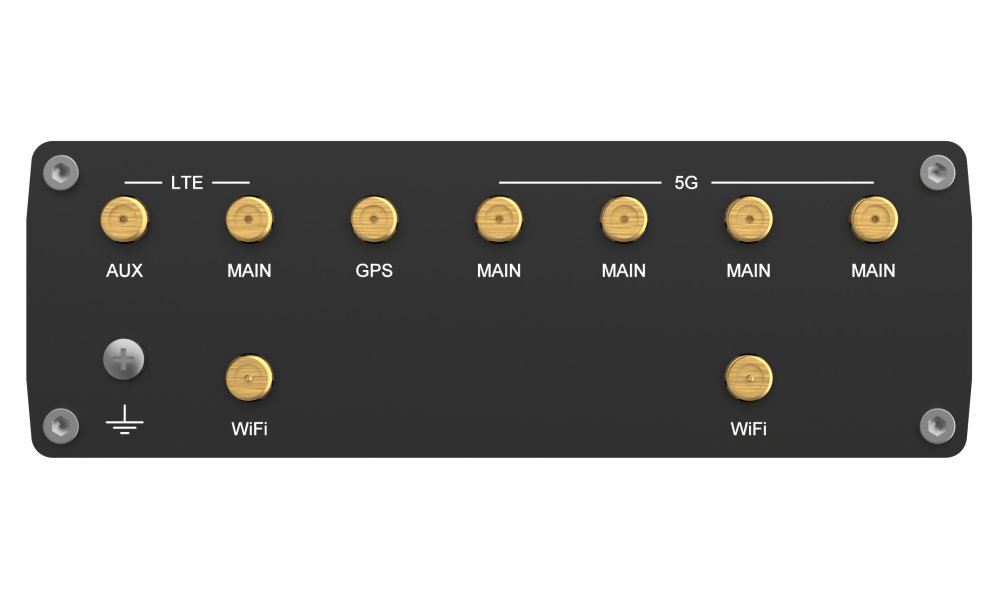 Anténa: 6× SMA konektor (5G/LTE), 2× RP-SMA konektor (Wi-Fi), 1× SMA konektor (GNSS)