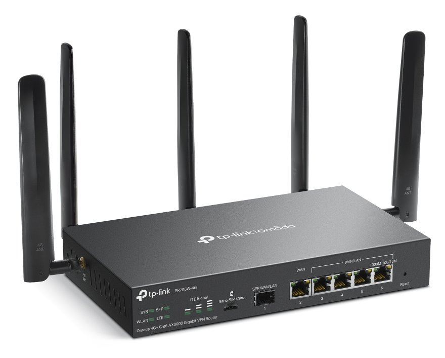 TP-link ER706W-4G Omada 4G+ Cat6 AX3000 Gigabit VPN Router Funkce Podpora 4G+ Cat6 *Vložte Nano SIM kartu a užijte si až 300 Mb/s. AX3000 dvoupásmová WiFi 6 *Podporuje 2402 Mbps na 5 GHz a 574 Mbps na 2,4 GHz* 6 gigabitových ethernetových portů *Po...Více info