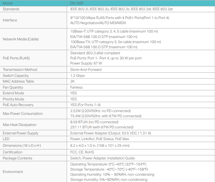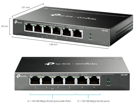 TP-Link Omada DS106P; - 6x 10/100 Mbps RJ45 port (4x PoE+ port); - Steel case; - Plug & Play bez nutnosti konfigurace; TECHNICKÉ VLASTNOSTI; Rozhraní: 6x 10/100 Mbps RJ45 port (4x PoE+ port); Switching kapacita: 1.2 Gbps; MAC Address Table: 2K; Rozměry...Více info