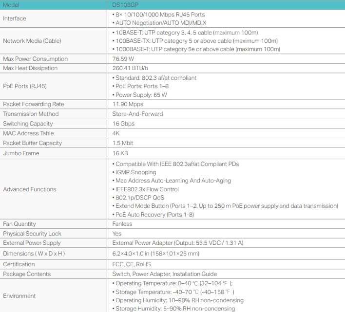 TP-Link Omada DS108GP; - 8× 10/100/1000 Mbps RJ45 ports; - 8 PoE portů - až 30W/port a celkově 65W pro všechny PoE porty; - Plug & Play bez nutnosti konfigurace; TECHNICKÉ VLASTNOSTI; Rozhraní: 8x 10/100/1000Mbps RJ45 Porty,; Switching kapacita: ...Více info