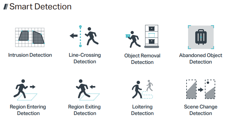 Inteligentní detekci pohybu - vstup do oblasti, překočení čáry, vniknutí a další.