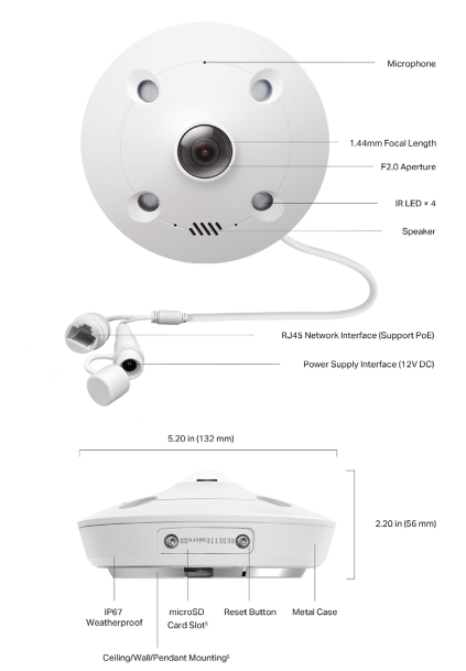 5Mpx, Fisheye se snímačem 1/2,7" CMOS a rozlišením 2560 × 1920.