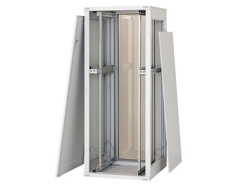 Svařovaný rozvaděč s odnímatelnými bočnicemi a zadním krytem s krytím IP20, nosnost 400 kg. Dveře skleněné s bezpečnostním tvrzeným sklem 4 mm.