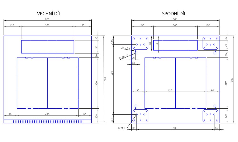 Svařovaný rozvaděč s krytím IP20, odnímatelnými bočnicemi i zadním krytem a nosností 800 kg. Dveře plechové, perforované s prostupností 80 %.