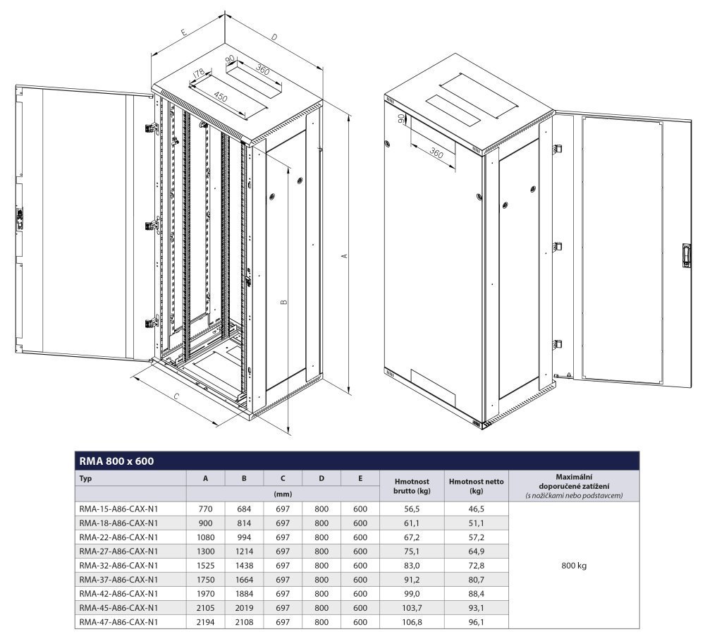Svařovaný rozvaděč s krytím IP20, odnímatelnými bočnicemi i zadním krytem a nosností 800 kg. Disponuje skleněnými dveřmi s bezpečnostním tvrzeným sklem 4 mm.