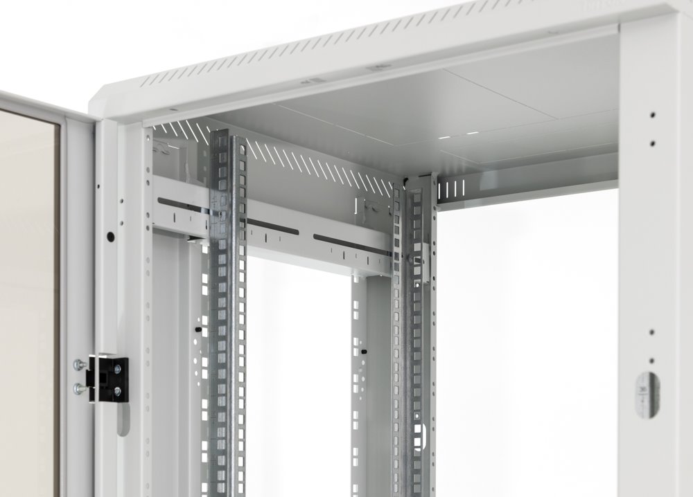 Svařovaný rozvaděč s krytím IP20, odnímatelnými bočnicemi i zadním krytem a nosností 800 kg. Disponuje skleněnými dveřmi s bezpečnostním tvrzeným sklem 4 mm.