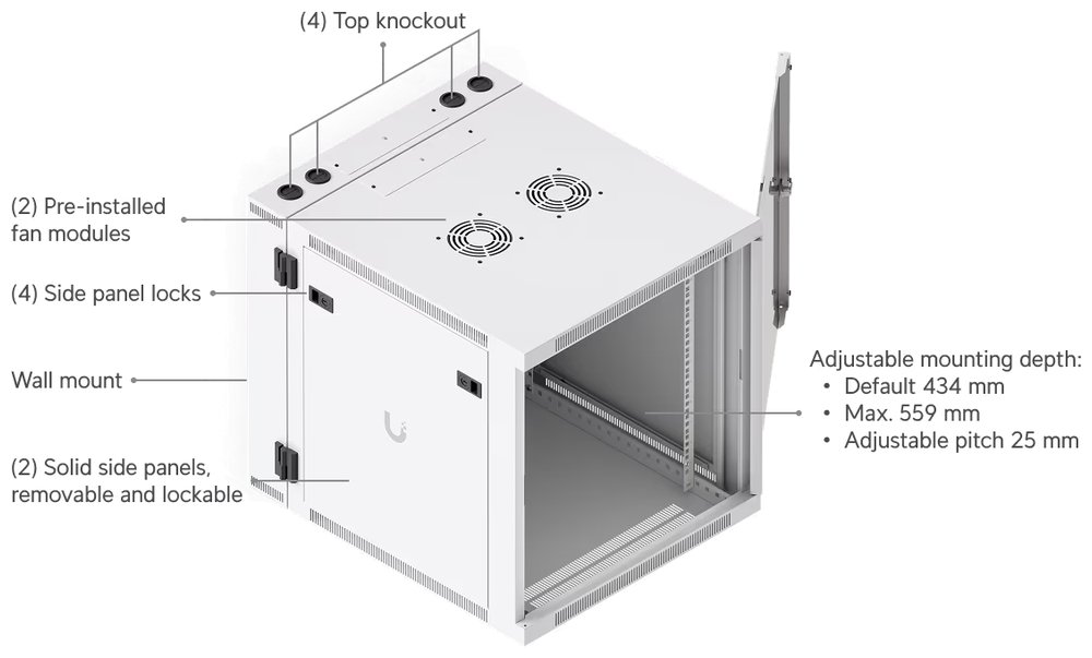 Kompaktní 12U rozvaděč od společnosti Ubiquiti představuje ideální řešení pro instalaci síťových zařízení v prostředí s omezeným prostorem. Rack je dodáván kompletně sestavený s integrovanými ventilátory pro aktivní chlazení a odnímatelným panely pro snadný přístup k zařízením. Konstrukce z ocelového plechu SPCC s povrchovou úpravou práškovou barvou v bílé barvě zajišťuje dlouhou životnost a elegantní vzhled.
