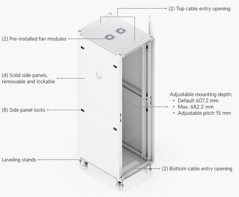 Rack je kompatibilní s originálním příslušenstvím Ubiquiti včetně police UACC-Rack-Shelf-CLV, teleskopických lišt UACC-Rack-Rails-Slide a sady pro správu napájení UACC-Rack-PM-Kit.