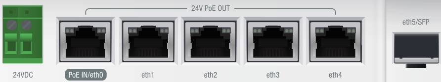 POE IN - Napájení po ethernetu pro EdgePoint ER-R6 má své limity a pro více napojených zařízení je doporučeno používat napájení přes DC svorkovnici. V případě potřeby je k POE IN účelu určený porty č. 1. Celá jednotka se napájí přes pasivní POE 24V/1.4A po vodičích (+1, 2, 4, 5; -3, 6, 7, 8). V případě využití POE IN na portu 1 není možné zároveň využít na tomto portu i funkci POE Out.