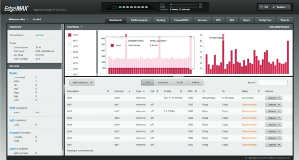 Co se konektorů a rozhraní týče, zařízení obsahuje (5) 10/100/1000Mbps ethernetových portů s podporou POE, (1) SFP port s rychlostí 1Gbps a DC svorkovnici pro přímé připojení el.energie. Celé zařízení je poháněno dvoujádrovým procesorem s taktem 600MHz, 2GB RAM a vnitřním uložištěm o velikosti 4GB.