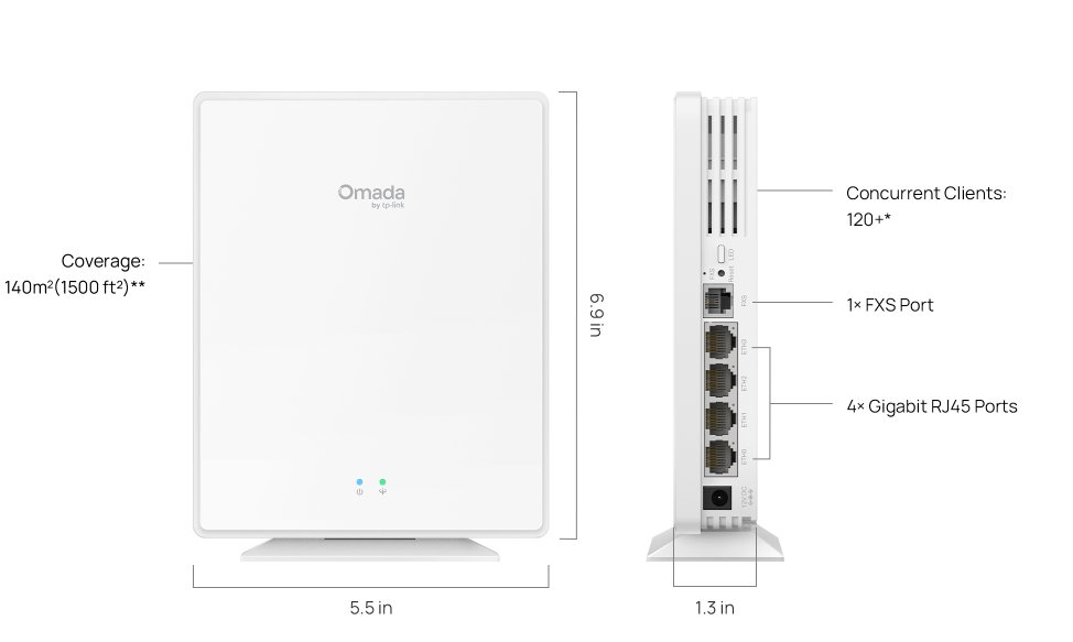 Prístupový bod, montáž na stul nebo stenu. Wi-Fi 6 s rychlostí až 1,8 Gbit/s, dlouhý dosah, MU-MIMO, OFDMA. Centralizovaná správa Omada SDN. 4x Gigabit Ethernet port, 1x FXS port, 1x GPON port.Více info