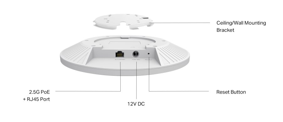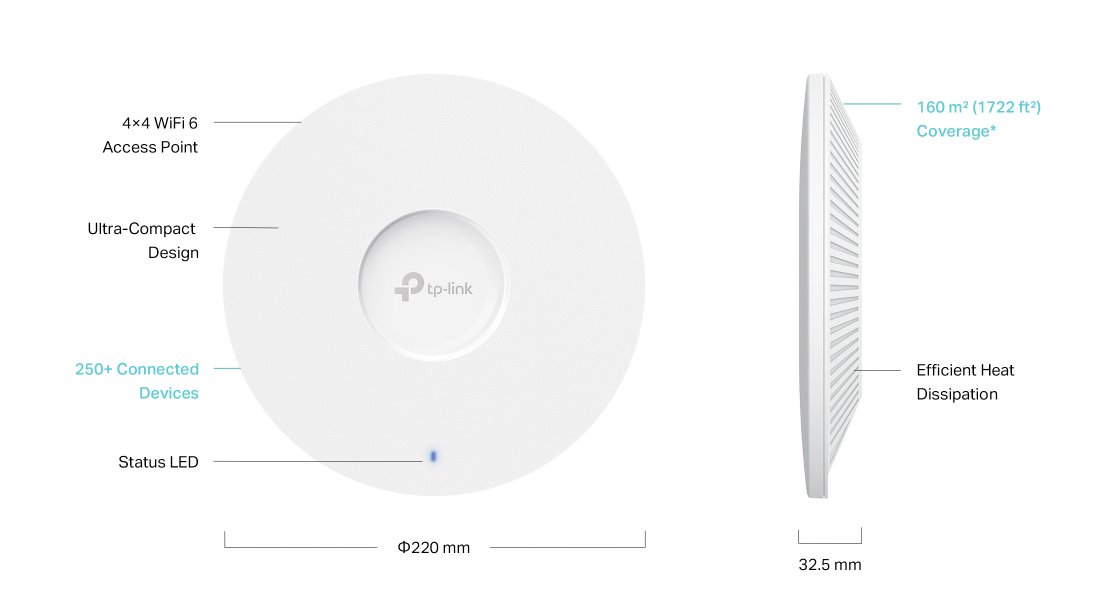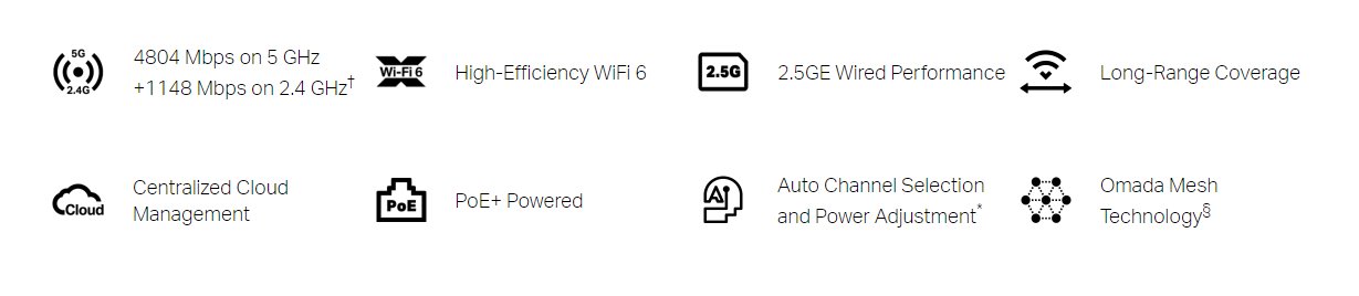 Router, dvoupásmové pripojení – 4 804 Mbps pri 5 GHz a 1 148 Mbps pri 2,4 GHz, standard WiFi 6, správa pomocí platformy Omada SDN, Omada Mesh, montáž na zed nebo na strop.Více info