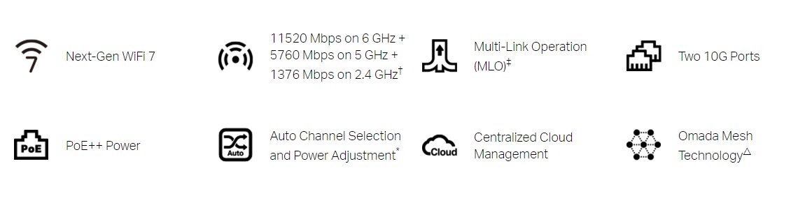 Router, trípásmové pripojení – 11 520 Mbps v pásmu 6 GHz, 5 760 Mbps pri 5 GHz a 1 376 Mbps pri 2,4 GHz, standard WiFi 7, Multi-Link Operation, Multi-RUs, správa pomocí platformy Omada SDN, kvalitní zabezpecení WPA3.Více info