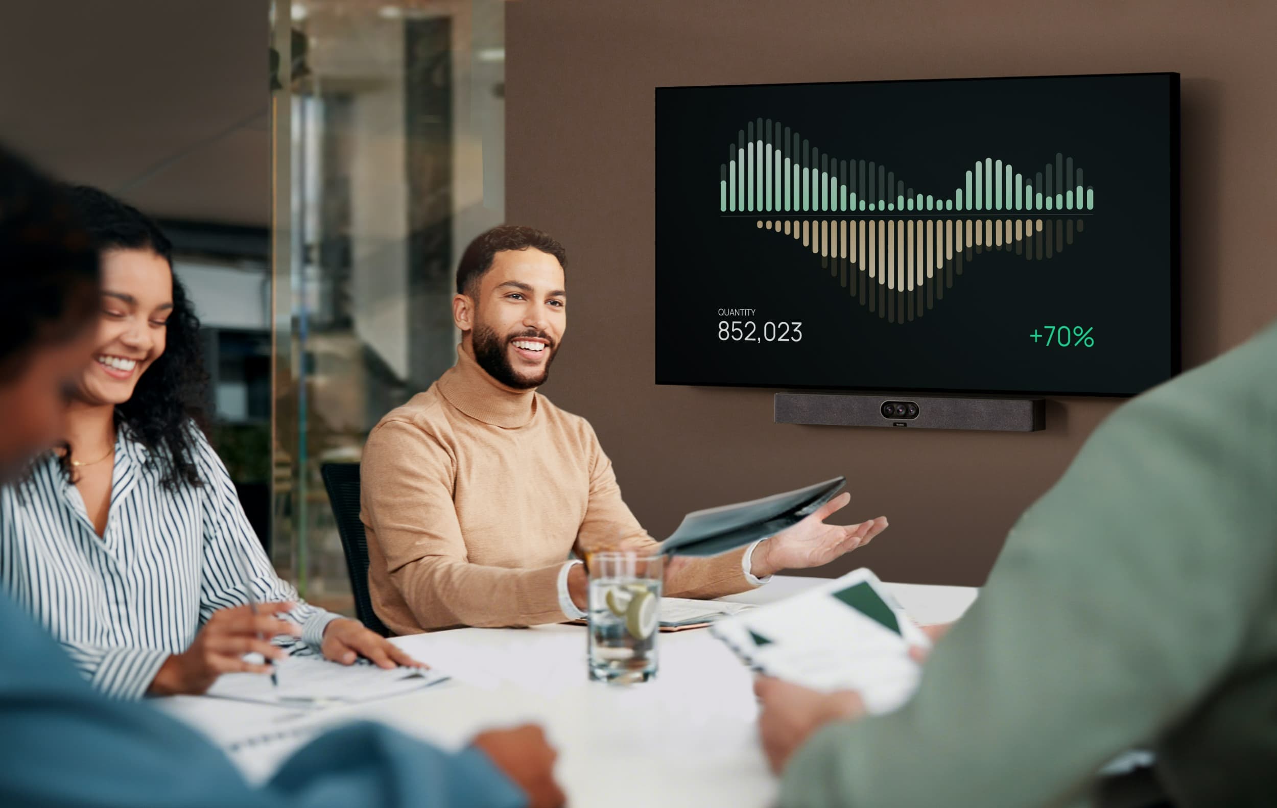 Pokročilý systém se třemi kamerami dosahuje ultraširokého zorného pole 151°, což umožňuje zachytit všechny účastníky v místnostech Focus Rooms. Zároveň poskytuje portrétní detaily ve vysokém rozlišení, zachycující každý detail interakce a vylepšující zážitek ze sledování schůzky pro vzdálené účastníky.