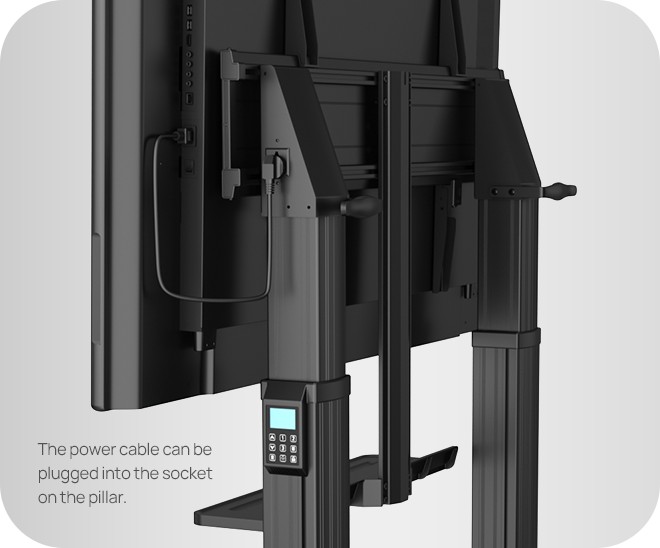 Sloupek podlahového stojanu je vybaven univerzální zásuvkou, která umožňuje přímé napájení konferenčního displeje bez nutnosti dalších zásuvek nebo prodlužovacích kabelů.