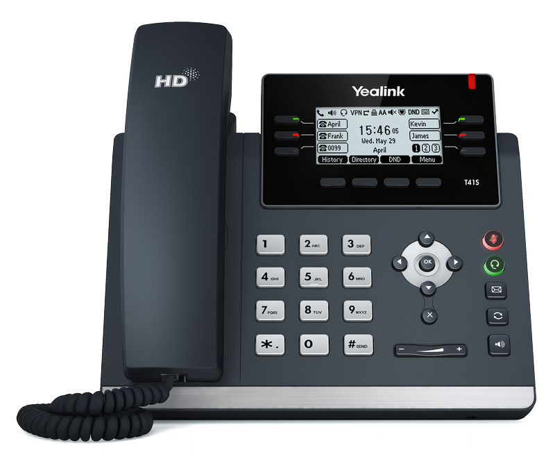 Elegantní manažerský telefon Yealink SIP-T41S je nejnižším modelem řady Yealink SIP-T4S s kovovou lištou. Je vybaven 2,7" černobílým podsvíceným LCD displejem s rozlišením 192x64 pixelů. Atraktivní čistý design s kovovou lištou sluší každé moderní kanceláři. Telefon Yealink SIP-T41S disponuje hned 6 SIP účty a dvěma 100 Mbs ethernetovými porty s podporou PoE . Nabízí 15 programovatelných tlačítek, kterým lze přiřadit jednu z 27 různých funkcí.